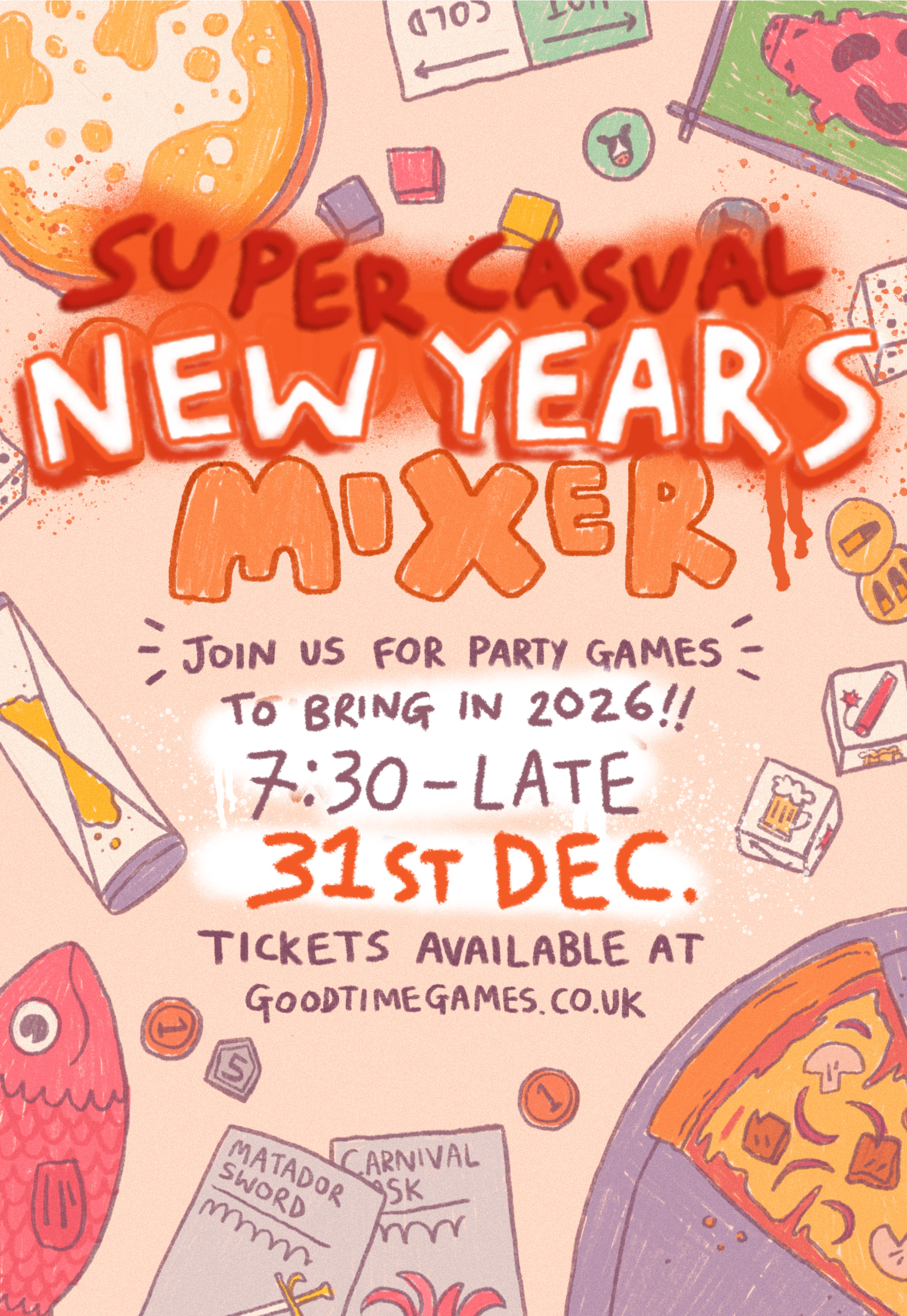 We will be kicking off gaming at 7:30PM, and of course ringing in the New Year with a countdown and some fizz!