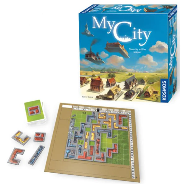 My City is a competitive legacy game in which you develop a city on your own playing board through the ages.